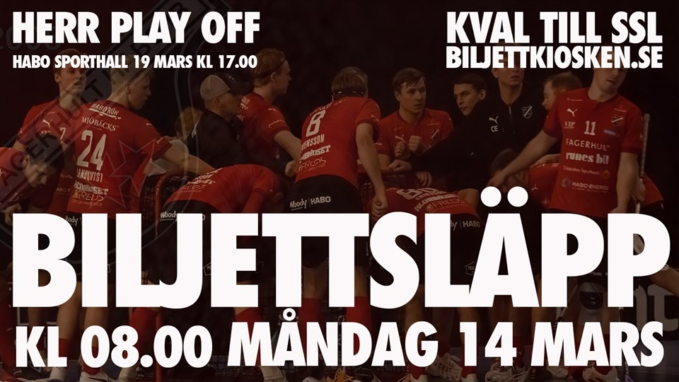 På måndag 14/3 klockan 08:00 släpps biljetterna inför match 1 i playoff i kvalet till SSL i mötet med Karlstad IBF. Denna match spelas i Habo Sporthall lördag 19/3 kl 17.00 Om det blir en tredje avgörande match kommer denna spelas i Habo sporthall lördag 26/3 klockan 17:00. Biljetterna till denna match släpps i så fall torsdag den 24/3 klockan 08:00. Karlstad IBF har enligt direktiv från Svenska innebandyförbundet rätt till en viss andel av biljetterna. Resterande biljetter som inte utnyttjas av Karlstad IBF kommer att släppas nu på torsdag den 17/3 klockan 08:00. Biljetterna bokas på https://www.biljettkiosken.se/event/220319-fagerhulthabo-karlstadibf Biljettpriser i kvalet: Vuxen 115:- Pensionär 100:- Barn/ungdom t.om. 16 år 70:- Aktiv/ledare 60:- Barn under 3 år i vuxens knä 0:- Ståplats 100:- Observera att det går att välja "ståplats" när man skall välja sektion om man önskar köpa ståplatsbiljett.Vi har i nuläget 55 st stålpatser Frågor angående biljetter? Kontakta oss på biljett@fagerhulthabo.se