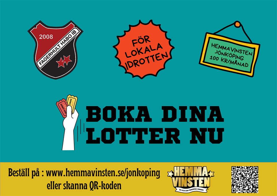 Sedan någon månad tillbaka finns Fagerhult Habo IB med som en av föreningarna i Hemmavinsten. Hemmavinsten är det lokala idrottslotteriet som drivs av Jönköpings Idrottsallians sedan 2010 och som ger dig som stöttar föreningen via lotteriet chansen att både göra dig själv och Fagerhult Habo IB till vinnare. Hemmavinsten är en fin möjlighet för lotteriets medlemmar både att vinna en betydande summa själv och samtidigt stötta klubben. Lotten kostar 100 kr/månad och 40 kr går tillbaka till vinstpotten. Det är två dragningar varje månad vilket innebär att det för tillfället går ut ca 69 000 kr till en ensam vinnare. Till det kommer ett stort antal extravinster som t ex Sportvinsten och Resevinsten. Vinstsumman regleras efter hur många lotter som säljs. Lotteriet har varit igång sen 2010 och har sen dess delat ut över 18 miljoner kronor till det lokala föreningslivet och de anknutna föreningarna. Utöver de 40 kronorna som faller tillbaka till vinstpotten så går det tillbaka pengar till föreningen som man registrerar sin lott på. Lotteriet har en återbetalningstrappa som startar på 34 kr/lott tillbaka till föreningen och som max uppgår till 42 kr/lott beroende på hur många lotter man säljer. För att nå högsta nivå så krävs det att man säljer 201 lotter/månad. Hur går man då tillväga för att registrera sig? Scanna helt enkelt QR-koden på bilden i artikeln och följ sen uppmaningarna som visas.