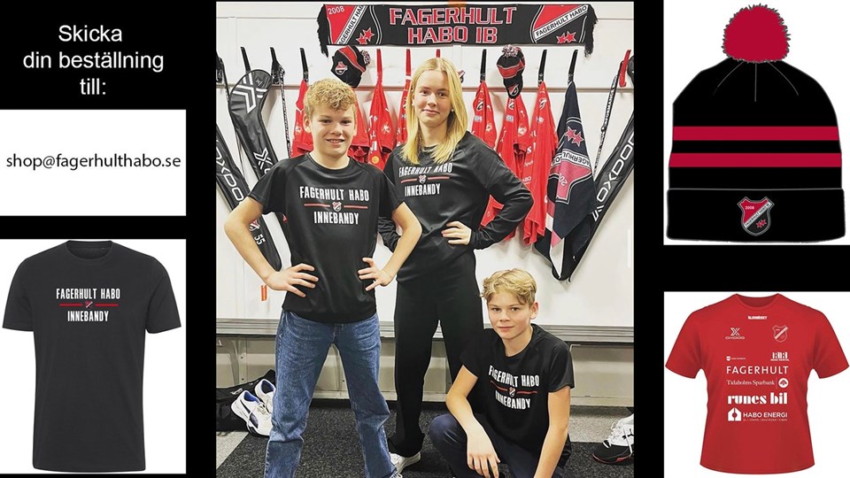 Nu öppnar vi upp möjligheten att beställa våra supporterartiklar online inför jul. Skicka in din beställning till shop@fagerhulthabo.se och hämta på plats i klubblokalen på överenskommen tid. Betalning via swish på plats. Antalet är begränsat så passa på innan produkterna är slut. Prislista och storlekar: Röd t-shirt (bomull) 99 kr Storlekar XS, S, M L - fåtal Svart t-shirt (funktion) 149 kr Storlekar 160 (12 years), XS, S, M och L Svart långärmad (funktion) 199 kr Storlekar. M och L Storlek S åter i sortiment vecka 49 Mössa 175 kr (Slutsåld) Ny modell (se bilden) kommer hem i slutet av månaden och kan förbeställas.