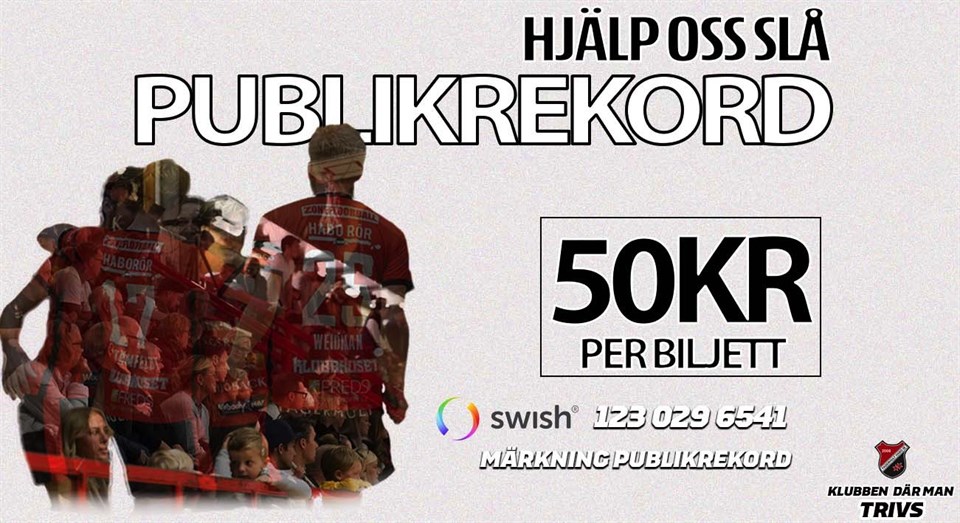 Nu slår vi publikrekord! -KÖP BILJETT OCH VAR MED I UTLOTTNINGEN AV EN SIGNERAD MATCHTRÖJA! Mellan 21:a och 22:a April kunde herrlaget spelat en avgörande match om avancemang till SSL, på hemmaplan. Nu säljer vi virtuella biljetter till matchen och hoppas att DU är med och slår publikrekord! En biljett kostar 50kr. Du får givetvis köpa så många du vill. Desto fler lotteri har, desto större chans har du att vinna tröjan. Betalning görs via swish och märks med ”publikrekord”. Nu fyller vi Habo Sporthall!