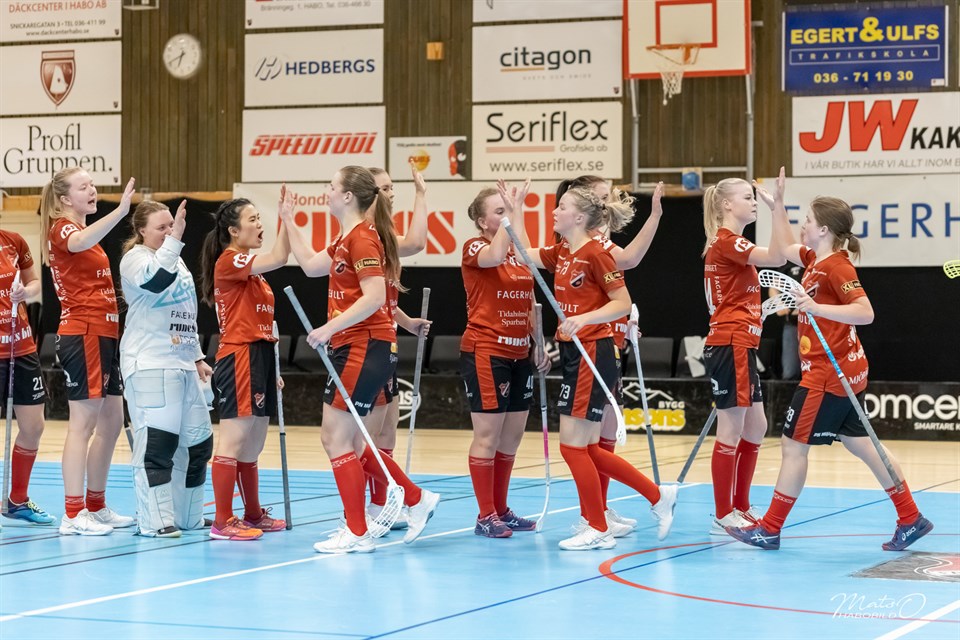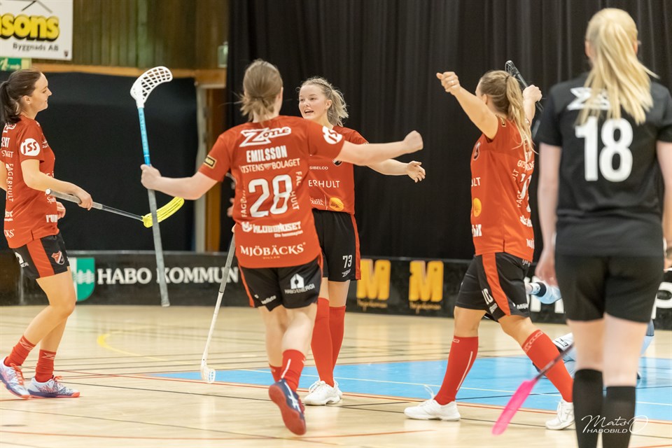 Det blev en målrik tillställning, inför en stor och entusiastisk hemmapublik, när våra damer mötte IBF Backadalen i den första matchen av två i kvalet till allsvenskan. FHIB tjejerna var på målhumör och vann med klara 14-3 (4-1 4-1 6-1) Redan i första anfallet, 39 sek, så spräckte vi nollan. Backadalen kvitterade visserligen men resten av både perioden och matchen gick i hemmalagets favör. Lagledare Anders Ingvarsson var givetvis glad men också samlad: - Vi gör ju en väldigt bra match men vi har också marginalerna med oss och är dessutom högeffektiva. Förutom en dipp i andra perioden, då vi tar en time out för att hitta tillbaka, så flöt det på bra. Tjejer går in och gör sitt jobb, både framåt och bakåt, och då är vi starka. - Nu kan vi glädja oss i kväll men i morgon tränar vi igen och då är det fullt fokus på bortamatchen på lördag. Innebandy är innebandy och man får inte slappna av en enda sekund. Mest på ”hugget” framåt var Amanda Ingvarsson med 5 mål tätt följd av Emelie Emilsson med 4 kassar. Matchens poängdrottning var annars Sara Anteryd med hela 9 poäng (2+7!) Backadalen då? Har man vunnit div 1 i Göteborgsserien så kan man betydligt bättre än man visade i kväll. Nu blev man nog lite stressade när bollarna ramlade in och då är det svårt att komma upp i nivå. Priset till matchens lirare, skänkta av Fröken frö och Tidaholms Sparbank, gick till Matilda Rehnström som var lugnet själv i kassen. Hos gästerna så prisades Lisa Tilly. Vi ska också tacka Comcenter som sponsrade ”klappror” och klacken på ”ståplats” som förhöjde stämningen! Härligt!! Matchfakta Nu är nästa match i Lundbystrand på lördag. Förutsättningen är att Backadalen måste vinna med 12 mål för att vinna totalt och 11 för att ta det till förlängning. Det kommer garanterat bli en helt annan tillställning. Backadalen kommer göra allt och mer därtill för att vinna och försöka komma ikapp. It ain't over until the..! Se alla grymma bilder från Mats Olofsson (habobild.se )