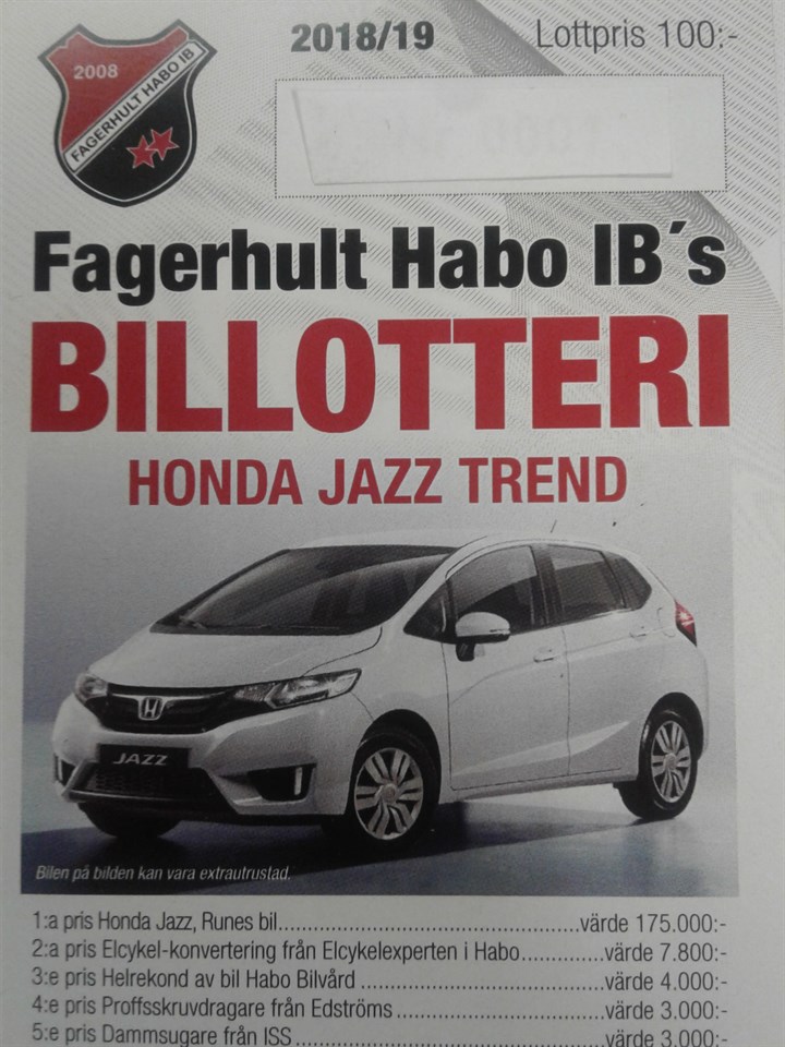 Det är bara några dagar kvar innan dragningen i vårt billotteri, så det börjar bli hög tid att införskaffa en eller flera lotter! 17 mars är sista försäljningsdag och då sker även dragningen. Vinstlistan presenteras efter herrarnas match mot Lerum. Matchen startar kl 13! Som vanligt massor av fina vinster kryddat med en Honda Jazz Trend från Runes Bil värd 175.000:-(!) i förstapris. Vi kommer att sälja vid ICA Habo. Går även att beställa genom vårt kansli som du kan läsa om på nedan info. Vill du se hela vinstlista och mer info om lotteriet så klicka på Billotteriet 2018/19