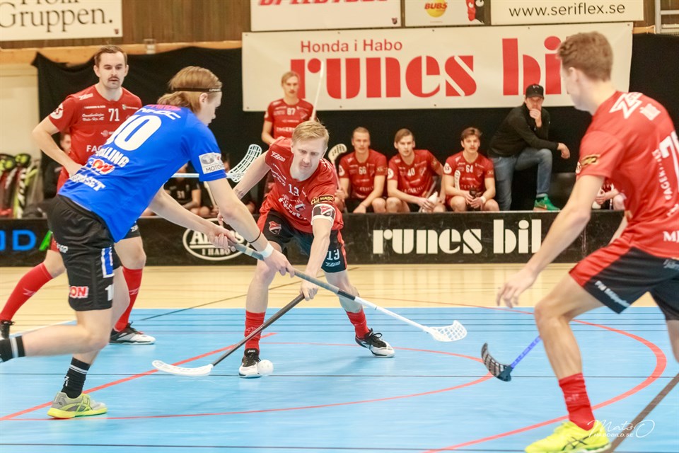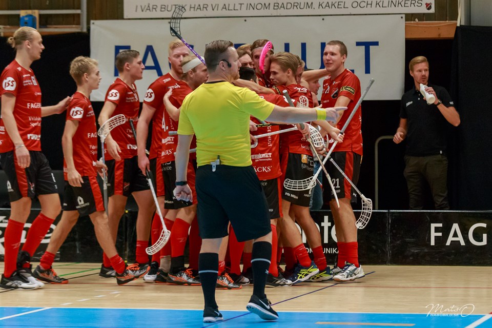 Det blev en häftig avslutning i matchen mot Karlstad. Underläge med 3-2 inför sista perioden men när hesa Fredrik ljöd efter en målexplosion så stod det 8-3 (0-0 2-3 6-0) på ljustavlan. Det började avvaktande då båda lagen visste vad det handlade om, att inte gå bort sig och ge motståndarna kontringslägen. Sett till farliga avslut så vann vi perioden på poäng. Bla hade Alexander Pernsteiner en solouppvisning som slutade med ett stolpskott. I andra kunde gästerna ta ledningen efter ett litet individuellt misstag, sånt som händer i bland. Sen blev det en jobbig period då vi fick två utvisningar med en minuts mellanrum. I spel 3 mot 5 så orkade vi inte stå emot utan Karlstad kunde öka till 2-0. Det skulle dock bli omvända roller strax efter. Först åker Karlstad på en 5 minutrare för hårt spel och sen, en stund senare, för att man slog bort bollen när det var avblåst. Det slutade med att John Widlert (ass Zälle) reducerade till 1-2 och Pontus Mattlin gjorde 2-2 (Björnell). Tiden går och känslan är att det inte ska bli några fler mål men Karlstad utnyttjar ett frislag med exakt minuten kvar. Inte så särskilt rättvist. Det blir en del omstuvningar i laget inför sista perioden. Vi går ner på två femmor och ökar farten och trycket mot gästernas mål. Det ger väldigt bra effekt. Först kvitterar Filip Wiklund på en sargretur efter skott av Björnell. Pontus Mattlin (Johan Uhlin) slänger sen iväg ett långskott som en skymd målvakt släpper in. Inte nog med det. När Noah Skogward (Pernsteiner) får ett skottläge från vänsterkanten så sitter bollen igen. Hastigt och väldigt lustigt så står det 5-3. Nu tar vi över match mer eller mindre totalt. Vi snurrar friskt i Karlstads zon och en time out hjälper dom föga. Först gör Pernsteiner (Adolfsson) 6-3 från nära håll, sen ökar Zälle (Wiklund) på till 7-3 och sen får Björnell (Zälle) avsluta med att göra 8-3 i boxplay. - De två första perioderna tycker jag vi är alldeles för omständiga i vårt spel. Vi är inte raka nog och tar inte bollen mot mål. I det defensiva spelet tycker jag vi har bra koll på Karlstad matchen igenom, säger Daniel Petterson ass tränare. - Tredje perioden går som bara farten, vi får fart på grejerna och varierar det långa spelet med snabba kontringar. Man märker att Karlstad är rätt trötta efter att rullat på två formationer matchen igenom vilket vi kan utnyttja. - Tycker hela laget ska ha en stor eloge för tålamodet vi visar upp, vi blir inte ivriga utan vi vet att det handlar om vår egna prestation i tredje för att vinna matchen. Positivt och roligt är också att vi har sju olika målskyttar. Detta är en riktig laginsats där vi jobbar otroligt hårt för varandra men ska jag lyfta några denna matchen så tycker jag att Alexander Pernsteiner är riktigt bra idag men även ”Efa” (Björnell) som jobbar otroligt hårt i båda riktningarna, avslutar Pettersson. XL-bygg var matchsponsor och deras val av matchens lirare gick till Filip Wiklund i FHIB och Kristoffer Bakke i Karlstad. I och med segern så befäste vi vår tredjeplats i tabellen. Nu väntar ett uppehåll till 16 dec då vi möter Lerum borta, som överraskande slog Onyx i eftermiddag. Det finns inga lätta matcher i den här serien.. Kul också att det var så många och tittade..ni är varmt välkomna tillbaka!! Bild: Mats Olofsson ( habobild.se)