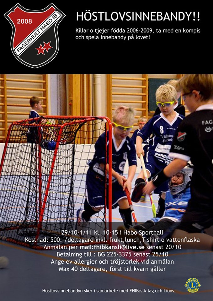 Dags för årets roligaste vecka, ta med en kompis eller två och kom och kör innebandy under lovet. 29/10-1/11 kl 10-15 i Habo sporthall Kostnad 500:- per deltagare inkl. frukt, lunch, t-shirt och vattenflaska Anmälan till fhibkansli@live.se senast 20/10 Betalning till BG 225-3375 senast 25/10 Ange eventuella allergier och storlek på tröjan vid anmälan. Max 40 deltagare, fört till kvarn gäller. VÄLKOMNA!!! Fagerhult Habo IB 9 okt 2018 0kommentarer