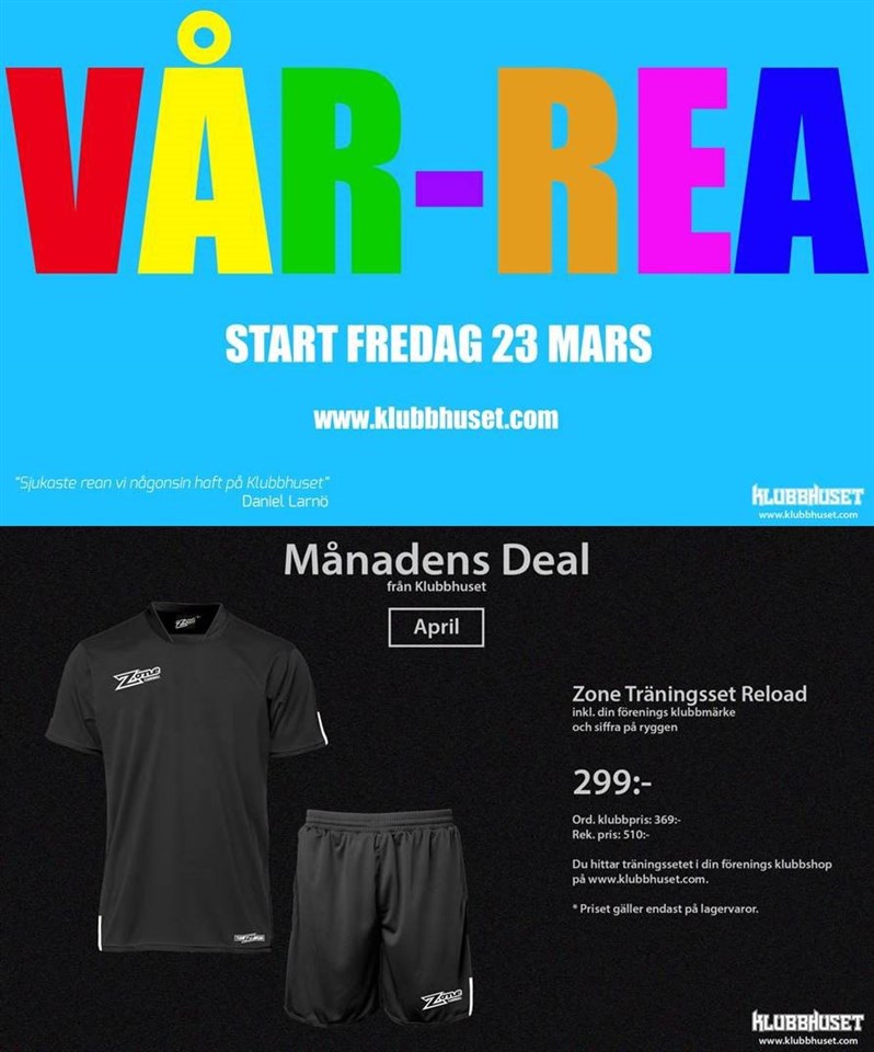 VÅR-REA på Klubbhuset Vi kommer, i samband med att vår-rean startar, även kicka igång ”Månadens Deal” för alla våra samarbetsföreningar och medlemmar. Under april gör vi en prissänkning på alla träningsset/träningströjor i klubbshoparna, och kommer bjuda på gratis ryggsiffra hela månaden. Se alla erbjudande här! Klubbhuset