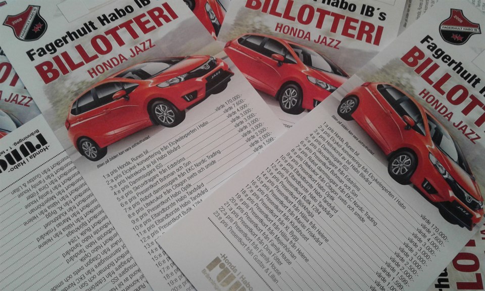 Som tidigare nämnts i veckan så är vårt tradionella billotteri på gång igen. En Honda Jazz från Runes Bil värd hela 170.000:- är första priset. Övriga vinster: 2:a Elcykel-konvertering från Elcykelexperten. Värde 7.600:- 3:e Helrekond av bil Habo Bilvård. Värde 4.000:- 4:e Dammsugaren från ISS. Värde 3000:- 5:e Skruvdragare från Edströms. Värde 3.000:- 6:e Presentkort Bohman & Son. Värde 3.000:- 7:e Robotdammsugare från EKC Nordic Trading. Värde 3.000:- 8:e Utekrukor från Citagon svets och smide. Värde 2.500:- 9:e Presentkort Habo Optik. Värde 2.000:- 10:e Eltandborste från Habo Tandvård. Värde 1.599:- 11:e Eltandborste från Habo Tandvård. Värde 1.599:- 12:e Presentkort Butik 1284. Värde 1.000:- 13:e Presentkort Björkhaga. Värde 730:- 14:e Presentkort Hälsa från Helene. Värde 500:- 15:e Presentkort Marias Friskvård. Värde 500:- 16:e Presentkort Klubbhuset. Värde 500:- 17:e Presentkort XL-Bygg Habo. Värde 500:- 18:e Presentkort Hälsa från Helene. Värde 500:- 19:e Presentkort Mejerihörnan. Värde 500:- 20:e Presentkort Family House. Värde 500:- 21:e Presentkort Dina Fötter. Värde 500:- 22:e Presentkort Family House. Värde 500:- 23:e Presentkort Gustav & Lillan. Värde 500:-. Totalt vinstvärde 208.028:-!! Vi tackar alla företag som är med och sponsrar och stöttar FHIB på det här sättet. Ni är guld värda! Lotteriet omfattar 3000 lotter. Dragning äger rum 2018 03 11. Vill du köpa lotten så kontakta vårt kansli 070-7765121 eller passa på vid Habo julmarknad sön 3 december. Försäljning kommer bla också att ske utanför ICA vid olika tillfällen.