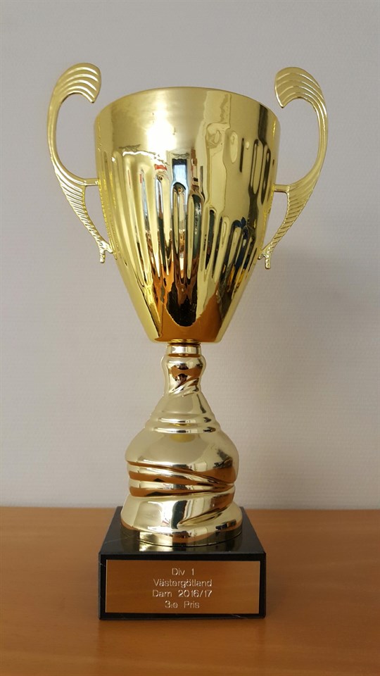 Då är den äntligen på plats, även om det tog sin lilla tid, damernas välförtjänta pokal för tredje platsen i div 1. Det var ju en kamp in i det sista men efter en fantastiskt bra avslutning på serien så lyckades tjejerna knipa en pallplats! Här är tabellen för er som glömt hur det slutade.. 1. Fristads GoIF 18 18 0 (0) 0 190-34 156 54 2. Tvåstad KIK 18 16 0 (0) 2 191-43 148 48 3. Fagerhult Habo IB 18 10 1 (0) 7 102-96 6 31 4. Mullsjö AIS 18 9 3 (1) 6 90-87 3 31 5. Skövde IBF 18 8 3 (2) 7 98-103 -5 29 6. IBK Alingsås 18 8 2 (1) 8 86-93 -7 27 7. IBK Lockerud Mariestad U 18 8 1 (0) 9 68-87 -19 25 8. Borås IBF 18 4 2 (1) 12 80-130 -50 15 9. Wårgårda IBK 18 1 2 (0) 15 49-161 -112 5 10. IBK Elfhög 18 0 2 (0) 16 54-174 -120 2 Fristad kvalade till allsvenskan men lyckades inte ta sig dit, tyvärr. Nu ser vi redan fram emot nästa säsong med nya tränaren Amanda Ingvarsson vid rodret. Ska bli vädigt spännande att följa.