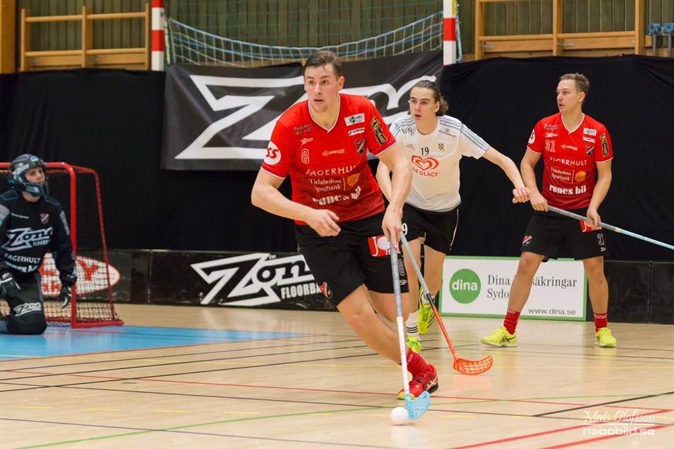 Det blev en match med olika ansikten i Malmö. Efter en första period som var riktigt bra hade vi ledningen med hela 4-1, skottstatistik11-2! 9 min in i andra så stod det 4-4 på resultattavlan. I tredje samlade vi ihop oss en aning och kunde ta ledningen med både 5-4 och 6-5 men det slutade ända med att Mamö kvitterade med bara minuten kvar i spel 5 mot 4. I förlängningen är vi närmast segern med ett ribbskott. Det hjälpte ju föga utan slutade alltså 6-6. Tränaren Conny Steenberg var givetvis dämpad - Jobbigt att tappa ledningen som vi har. Vi är mycket bättre i första och reser oss i tredje. Som vanligt blir vi darriga när vi har ledningen och det sitter lite i huvudet med tanke på dom resultaten vi har i ryggen. Vi skulle vunnit den här matchen, ingen tvekan om det! Det var i allafall bra att vi inte förlorade utan kan hålla Malmö efter oss i tabellen nu under uppehållet. På spelarsidan var det enda glädjeämnet att Jonatan Olsson (bilden) gjorde två mål, sina första den här säsongen. Vi hoppas att det släpper rejält för honom nu. Det har ju varit ett tufft schema vi har haft, det får vi inte glömma. Bara 4 hemmamatcher av dom 11 spelade. Nu vänder det och 7 hemma känns ju betydligt skönare! Nästa match är hemma mot Onyx. Inte förens 17 december spelas den eftersom det är VM uppehåll. Lite märkligt att man lägger det största mästerskapet mitt i säsongen. Undra hur man tänkte där, eller rättare sagt, tänkte man överhuvudtaget? Läs mer om matchen J-nytt Bild: Mats Olofsson (habobild.se)