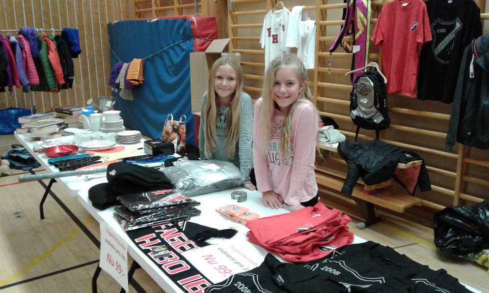I lördags eftermiddag hade vi loppis i B-hallen i samband med att både dam- och herrlaget hade matcher. 6st hade anmält sig att vara med, så det blev ingen jättesuccé, får vi i ärlighetens namn säga. Vi tackar i alla fall dom som var där, kanon! Vi hoppas att det gav några kronor tillbaka! Vi som förening hade också laddat upp med diverse saker och vi tackar alla som var med och hjälpte till på ett eller annat sätt. Särskilt tack till grabbarna i P02, Jonathan Carlsson, Anton Johansson och Anton Albin som ställde upp på ett föredömligt sätt! Detta var ju första gången vi prövade det här konceptet. Nu får vi utvärdera det hela och se vad vi kan förbättra eller om intresset är tillräckligt stort för att eventuellt göra detta fler gånger. Det tar oftast lite tid innan saker och ting sätter sig också.. På bilden är det Agnes Björling och Tindra Henriksson som också hjälpte till med försäljningen. :-)