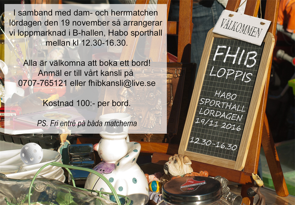 OBS! Du har väl inte glömt/missat att vara med på loppisen på lördag. Habo sporthall B-hallen mellan kl 12.30-16.30. Anmälan sker till vårt kansli på 0707-765121 eller mail fhibkansli@live.se. Kostnad 100:- per bord. Glöm inte att anmäla er! Varmt Välkomna! OBS! Det kommer vara fri entre' på både damernas match mot IBK Lockerud kl 13.00 och herrarnas mot IBF Göteborg som börjar kl 16.00.