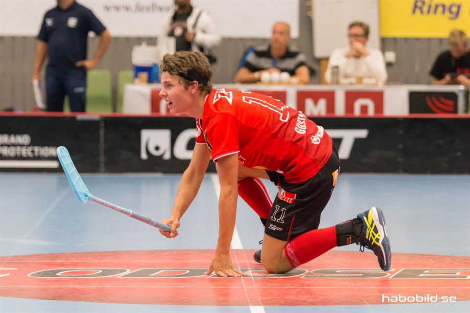 Det blev ett riktigt målkalas när U-laget besegrade Smedjan i premiären. 11-9 (5-3 2-3 4-3). Fokus låg inte på försvarsarbetet utan full fart framåt gällde. Smedjan kom med ett rutinerat lag med bla Patrik Sernelid (född-83) som har massor av matcher i både SSL, allsvenskan och div 1. 4:a mål blev det från hans klubba. Han överglänstes dock av 15-årige Tim Andersson-Carlsson (bilden) som som blev lite av en matchvinnare med sina 4 mål och ett ass. När Smedjan reducerade till 10-9 med ca 6 min kvar så skickad Tim in slutresultatet 45 sek senare. Lite dramatik blev det dock i slutet då vi fick spela 3 mot 5 men grabbarna redde ut det. Se alla matchhändelser här: matchfakta Nu väntar Falköping borta på fredag kväll.
