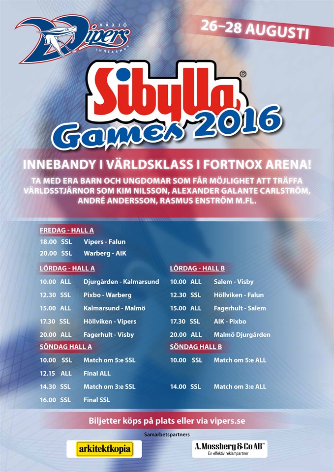 Herrlaget åker till Växjö och Sibylla cup till helgen som kommer. Det är både lag från SSL och Allsvenska som är med. Dock spelar man inte mot varandra, vilket är väldigt synd. Alla är tillgängliga och kommer att följa med. - Inga större skador heller att rapportera, lite småskavanker bara, säger Conny Steenberg. - Blir en trevlig helg med både gemenskap och bra matcher, avslutar Conny. Truppen: Johan Ringqvist Tommy Jonsson Martin Ullström Pontus Mattlin Samuel Olsson Daniel Pettersson Adam Fridh Jakob Lundström Emil Lif Albin Lundell Jeff Adolfsson Tobias Zälle Efraim Björnell Robin Levander Jonatan Olsson Filip Wiklund Jesper Bromander Hampus Bromander Jonas Elf Alexander Pernsteiner Albin Claesson Så har ni inget särskilt för er så bege er till mörka Småland.. Bild: Från Växjö Vipers hemsida