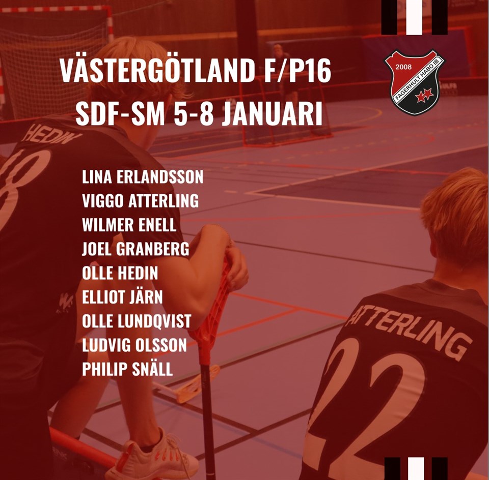 Den 3-6 januari spelas SDF-SM för tjejer och killar födda 2006. Vi är väldigt stolta och glada över att ha hela nio av våra duktiga ungdomar uttagna till att representera Västergötland i turneringen. Ett bra kvitto på att vi har en bra verksamhet i våra ungdomslag. Vi gratulerar och önskar hela gänget lycka till i januari. De uttagna är: F16 Lina Erlandsson Du hittar hela truppen här P16 Elliot Järn, Fagerhult Habo IB Joel Granberg Ludvig Olsson Olle Lundqvist Wilmer Enell Philip Snäll Olle Hedin Viggo Atterling Du hittar hela truppen här Fagerhult Habo IB 2 nov 2022 1kommentar