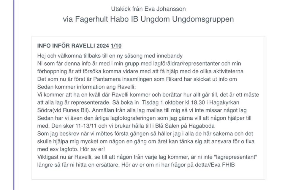 Hej, Vi bjuder in till uppföljningsmöte / föräldramöte för uppföljning kring punkterna kring föräldrauppgifter från förra mötet. Vi kommer även berätta lite mer kring cuperna i Linköping och det kommer även inom kort komma lite mer info om cupen här på laget.se Välkomna till Sporthallen på Tisdag 17/9 kl. 17.45. Ps. Vi behöver även hjälp med en eller flera personer som kan ta hand om försäljningen av Ravelli produkter som föreningen anordnar. Bifogar bild med mer information om mötestid etc. /Ledarna P10