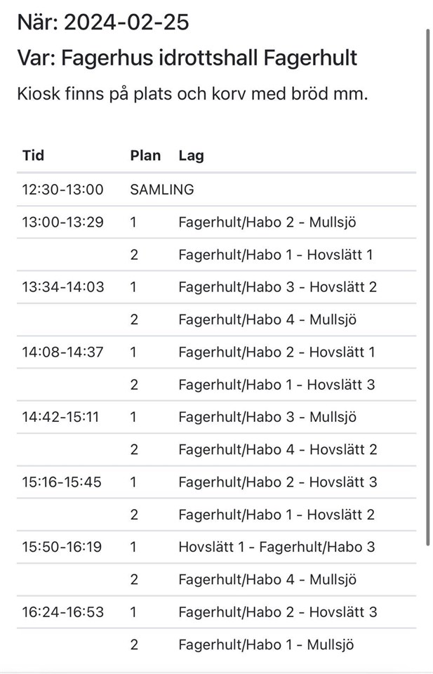 Hej, Bilfogar spelschemat i sin helhet. Vi är många barn anmälda vilket är superkul, och kommer därför köra något längre matcher än förra tillfället. 2x12 min är spletiden. Skriv gärna upp er i gästboken gällande hjälp i kiosk och sekreteriatet. Försäljningen i kiosken går som sagt direkt till lagkassan så vill ni sponsra med något hembakat är det också välkommet. Vi ledare kommer ha full upp med att coacha killarna, döma matcher så ta hjälp av varandra uppe på läktaren så att inte samma personer behöver stå i kiosk / sitta sekreteriat under hela dagen. Nedan ser ni lagindelningen: Lag 1 Lias, Loui R, Loke, Charlie, Arvid, Lukas, Vilmer, Malte H Lag 2 Sigge, Malte F, Hilmer, Filip, Isak, Valle, William Ström, Sigvald Lag 3 Loui A, William K, Wilgot, Gabriel, Ebbe, William Storm, Elias, Vide Lag 4 Melvin, William L, Elliot, Sam, Vidar, Alvin, Wiggo, Oliver Samlingstider: Lag 1 och 2 samlas 12:30. Lag 3 och 4 samlas 13:00 i ett av dem uppmärkta omklädningsrummen. Vi behöver hjälp med att förbereda kiosken där vi ska servera korv med bröd och även ha kaffe, så det är bra att vara i god tid.