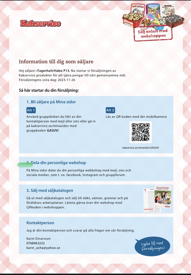 Hej Nu drar kakförsäljningen igång 😊 hur ni registrerar er se bifogad bild. Jag kommer dela ut beställningskataloger på träningen på måndag. Hör av er vid frågor! https://www.kakservice.se/minasidor/GASUVI Mvh Karin, lagförälder P-13 18 okt 2023 0kommentarer