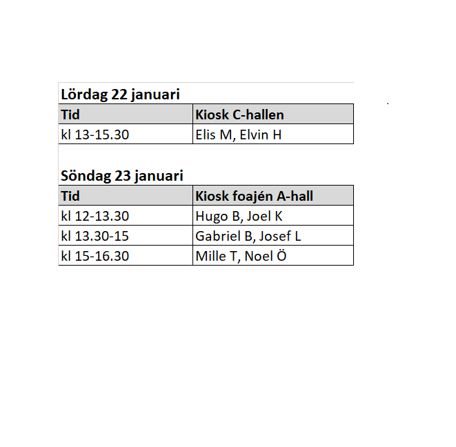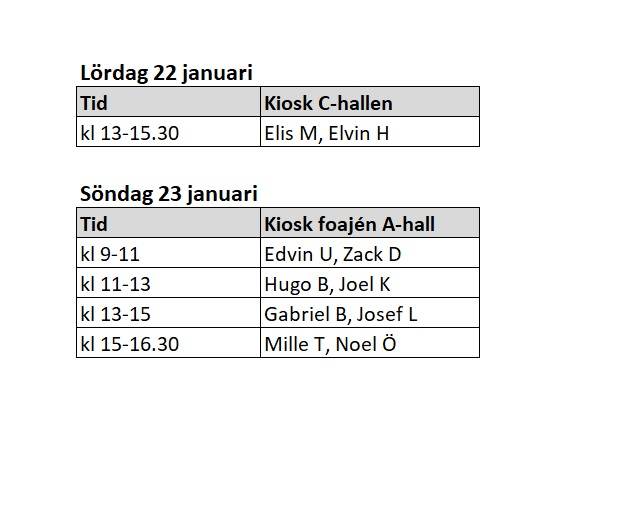 Hej, Nu är det dags för poolspel för 2 av lagen på lördag så det finns många föräldrar som kan hjälpas åt med sysslorna, byt med varandra vid behov. Alexander L Axel L-sekretariat Benjamin B-covidpass/sarg Billy/Harry/Frank C-covidpass/sarg Carl H Edvin F-Kiosk Elvin G Karl N-kiosk Ludvik K-kiosk Melker W-plocka fram stolar till sittplatser Morris G Sigge E-tvätt Theo B Vi ses!
