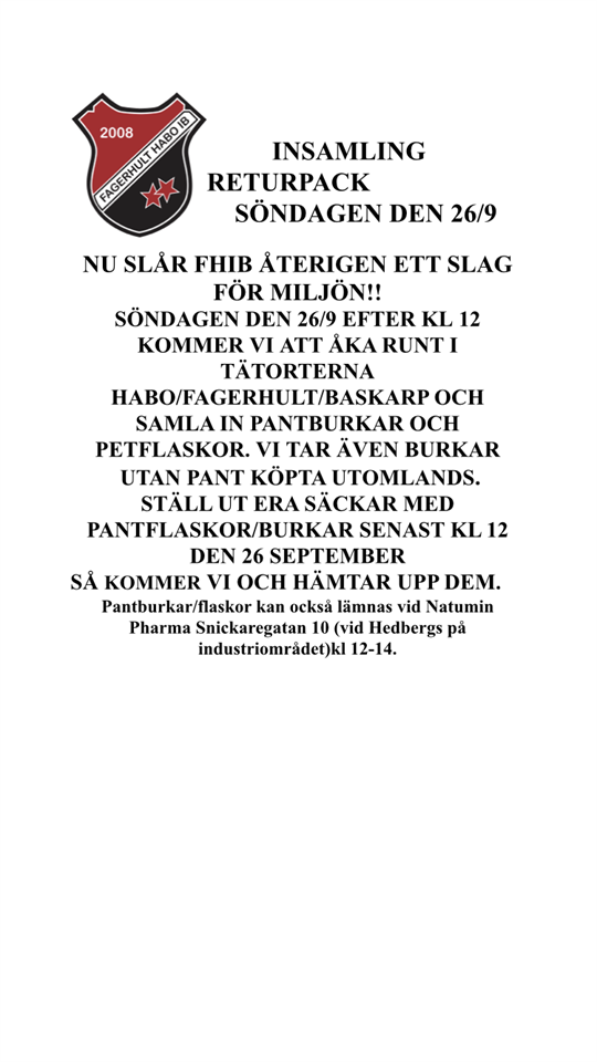 Hej Nu är det dags för panta mera insamling igen den 26/9 från kl 12. De som ska dela ut lapparna minst en vecka innan är: Zack Dahlslätt Mille Thelin Herman Ljung De som ska samla in den 26/9 från kl 12 är: Wilhelm Jonsson Lucas Lilliegren Olle Levander Ni kommer själva överens hur ni ska lägga upp det. Antingen hämtar man papperna hos Eva i styrelsen kontakta henne för hjälp bagaregatan12@gmail.com Eller om man skriver ut lapparna själva behöver ca 450st. De ska delas ut på Lagget och Kråkeryd samma område plockar man upp burkarna på. Det är samling kl 12 26/9 vid Natumin Pharma Snickaregatan 10 ( vid Hedbergs på Industriområdet) så vi ser att alla är på plats. Eller hör av er om ni kör direkt till era områden. P-10 8 sep 2021 16kommentarer