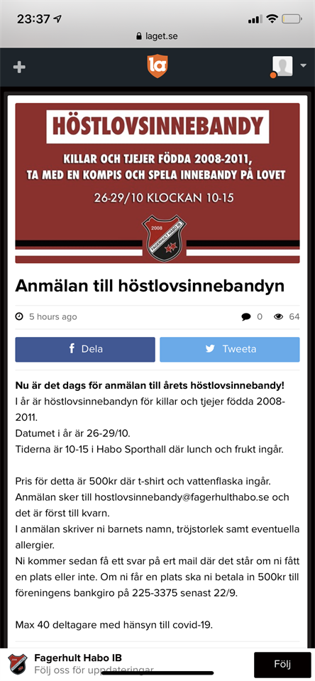Föräldrarmöte Måndagen den 28/9 har vi planerat för föräldrarmöte inför säsongen 2020/21. Vi kommer att köra föräldrarmötet samtidigt som träningen dvs kl 18.15 i Fagerhus. VI har bokat samlingssalen i Fagerhus, dvs den lite större salen där vi brukar ha avslutningar, för att vi ska kunna sprida ut oss och hålla Corona avstånd. För er som inte önskar vara med kommer det finnas möjlighet att vara med på mötet via Microsoft Teams som ett digitalt möte. För er som önskar detta ber vi er att mejla till christian.bergklint@fagerhult.se och anmäla att ni vill vara med via Teams, vi kommer sedan mejla till anmälda personer med en länk för att ansluta sig till föräldrarmötet. Välkomna! Mvh Tränarna i p10 P-10 23 sep 2020 2kommentarer