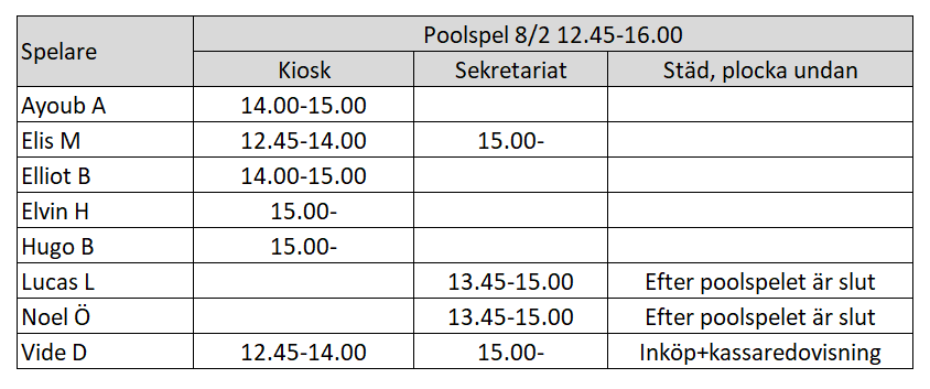 Dags igen! Här kommer schemat för helgens poolspel i Fagerhus. Alla föräldrar till barn som är med och spelar har uppdrag att sköta. Se till att vara där i tid så ni hinner få info om uppdraget. Lycka till!