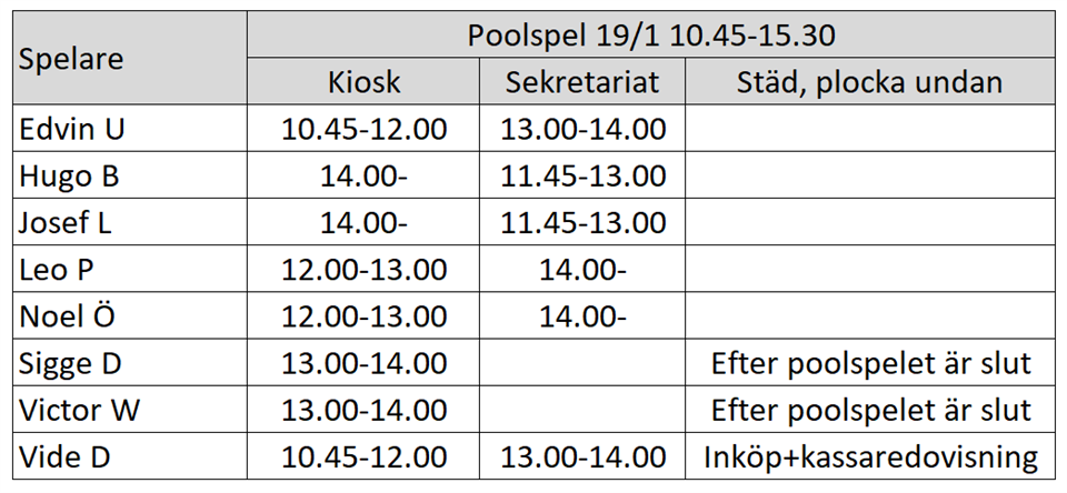 Här kommer kiosk- och sek.schemat för poolspelet i Fagerhus 19e januari. Alla föräldrar till barn som är med och spelar har uppdrag att sköta. Se till att vara där i tid så ni hinner få info om uppdraget. Lycka till! P-10 12 jan 2020 2kommentarer